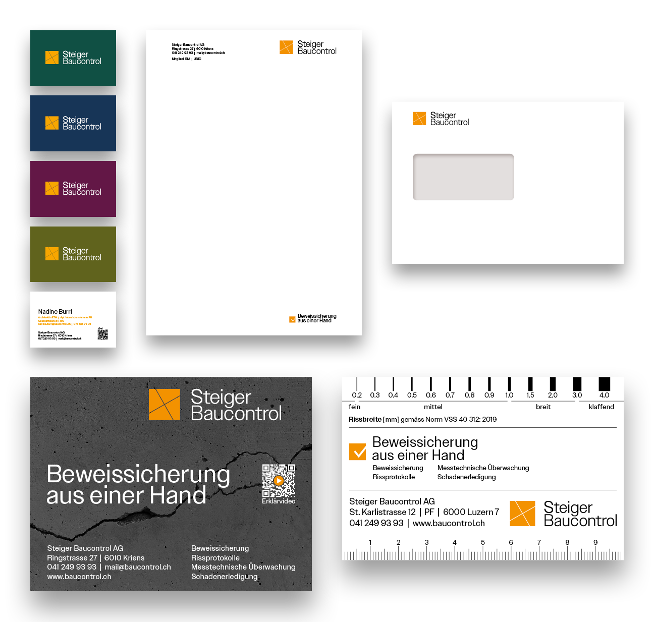 Steiger Baucontrol überprüft Gebäude, neben denen gebaut wird – um neue Risse zu beweisen, wenn es sein muss. Das Logo zeigt die vier Bereiche des Unternehmens, von denen jeder seine eigene Farbe hat.