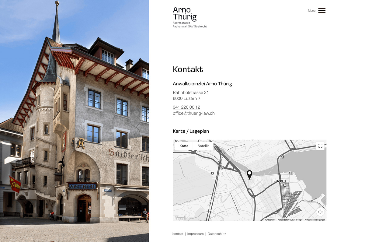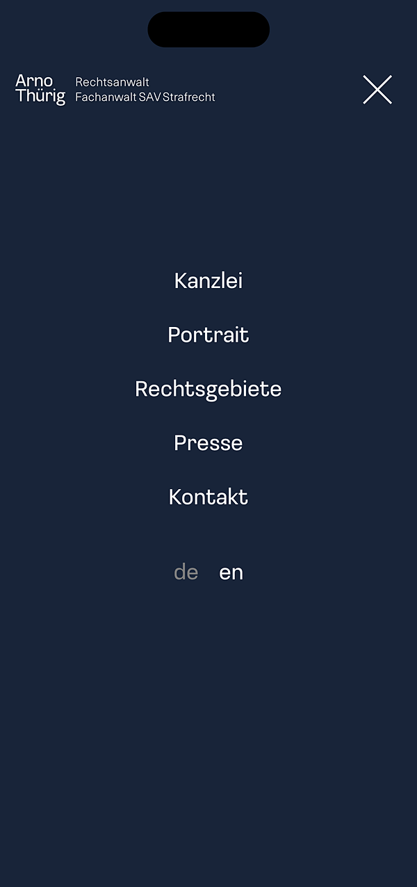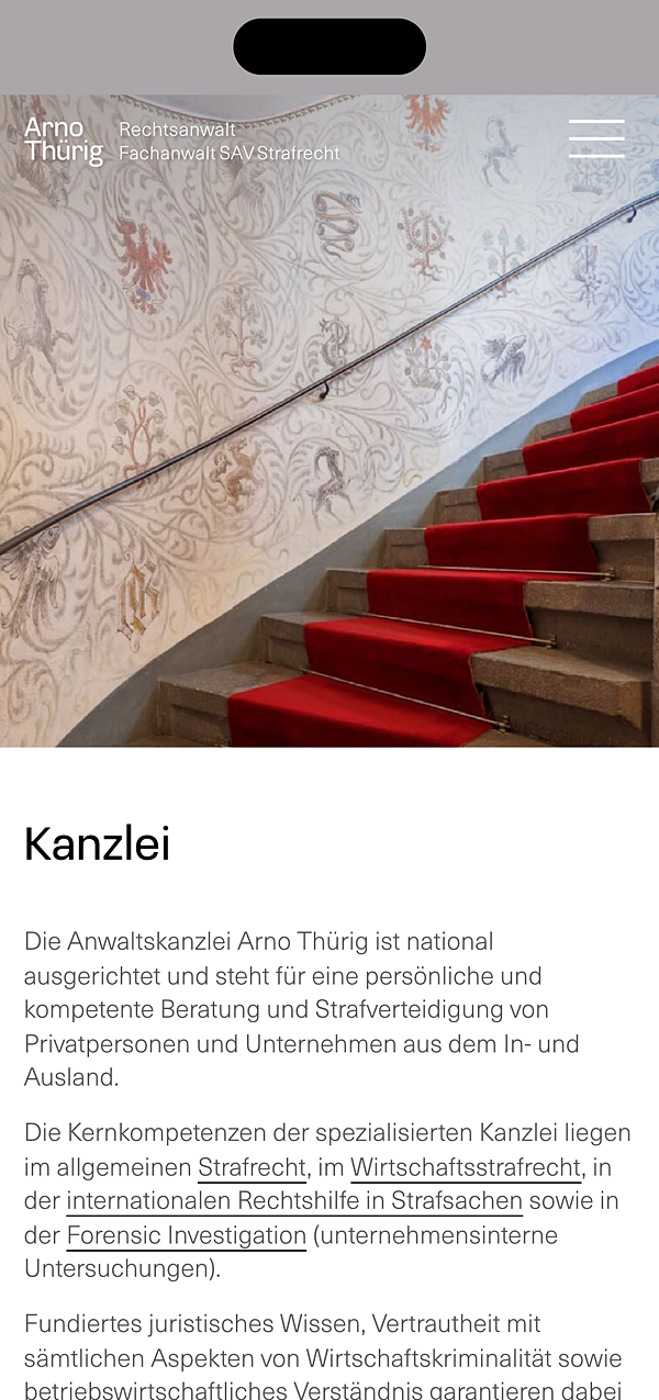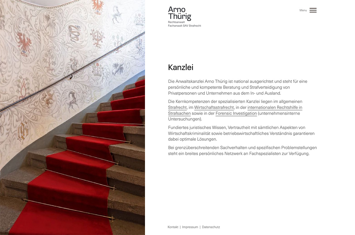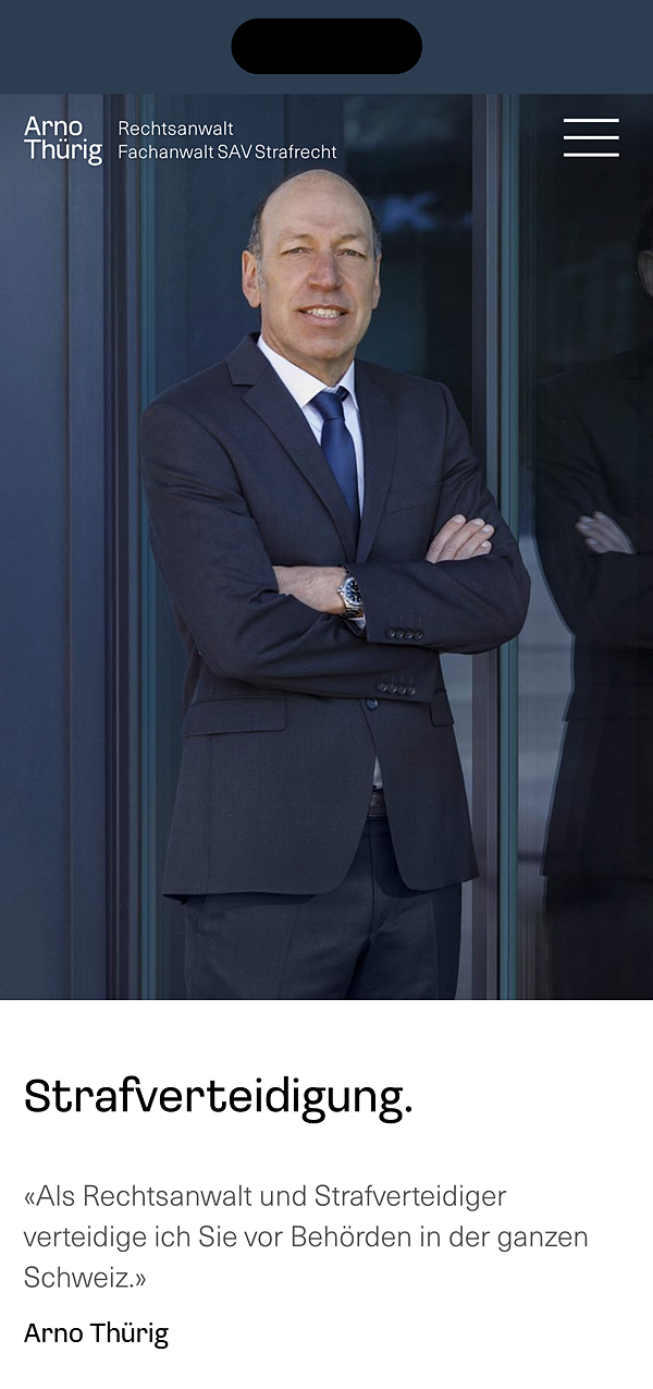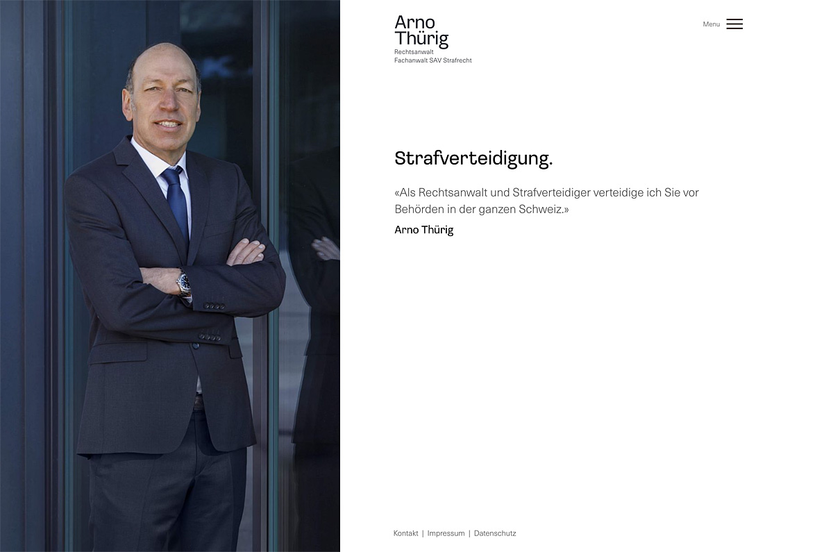 Arno Thürig ist Rechtsanwalt und Strafverteidiger. Direkt und klar verteidigt er seine Klientinnen und Klienten vor den Behörden in der ganzen Schweiz. Auch ganz ohne Schnickschnack: sein neuer Webauftritt mit einfacher Wortmarke.